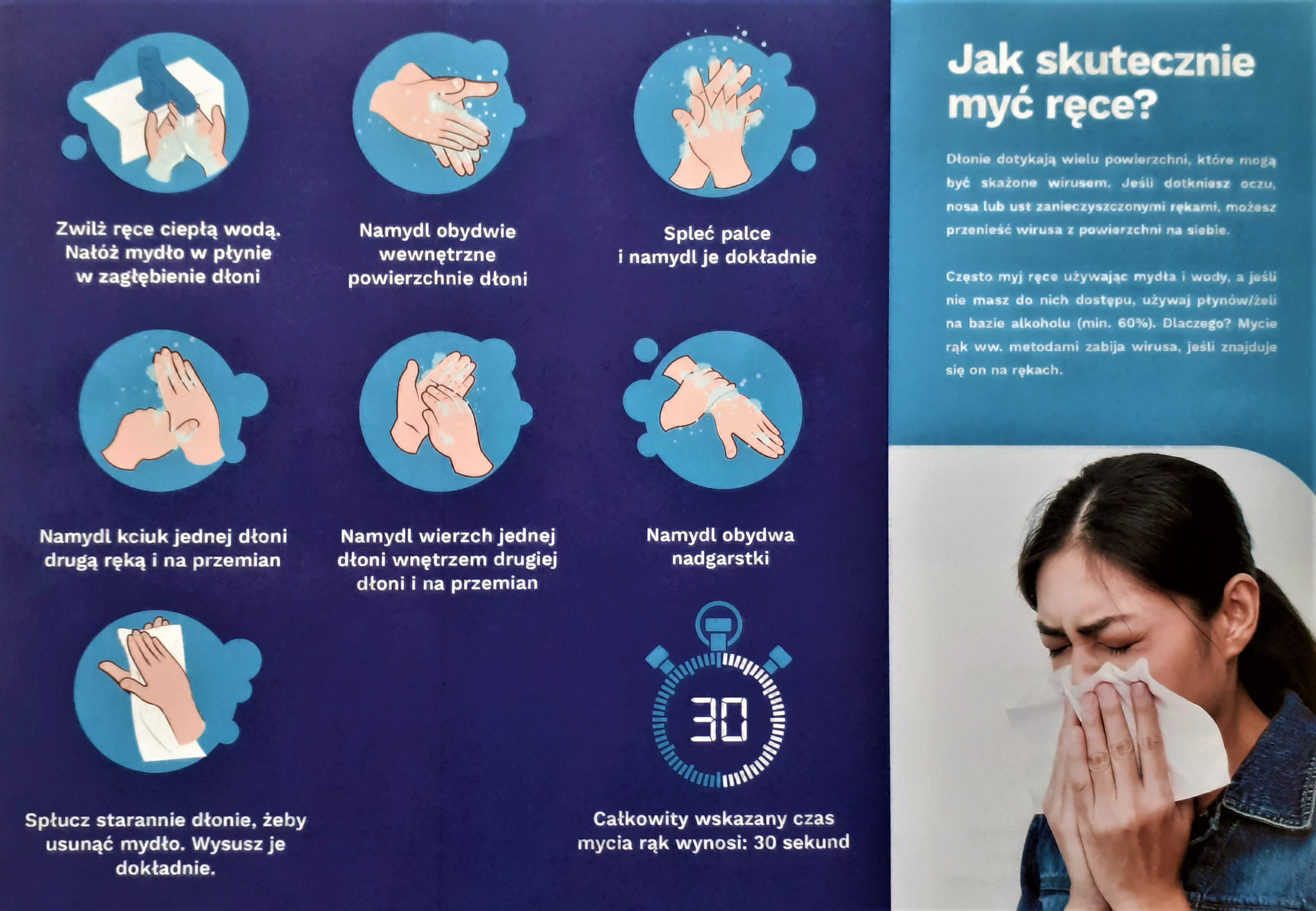 - częste mycie rąk wodą z mydłem intensywnie przez minimum 30 sekund, a także stosowanie specjalnych żeli myjących i środków dezynfekujących