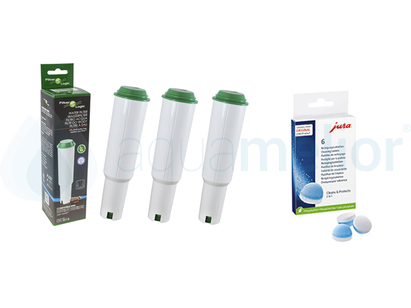 3x Filter Logic CFL-801B Filtr do ekspresu ciśnieniowego Jura Claris White + Jura 62715 Tabletki czyszczące 6 sztuk