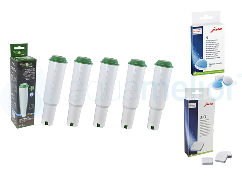 5x Filter Logic CFL-801B Filtr do ekspresu ciśnieniowego Jura Claris White + Jura 62715 Tabletki czyszczące 6 sztuk + Jura 61848 Tabletki odkamieniające 9 sztuk