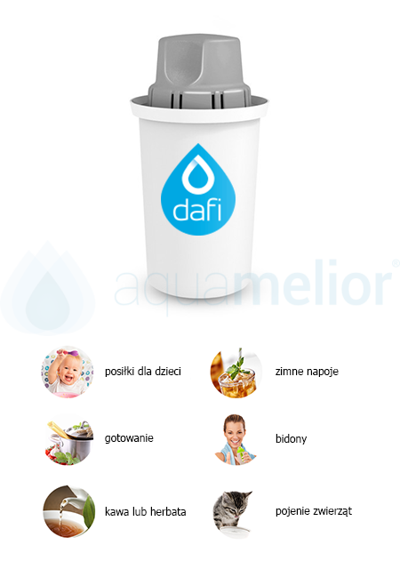 Filtr zmiękczający wodę kranową został stworzony z myślą o osobach, które chcą polepszyć jakości wody kranowej i sprawić, że stanie się ona idealna do gotowania w czajniku i parzenia na jej bazie kawy oraz herbaty. Woda filtrowana sprawdzi się również w ekspresie do kawy, żelazku czy nawilżaczu powietrza. Dafi AGD+ zapobiega wytrącaniu się kamiennego osadu poprzez redukowanie nadmiaru soli wapnia i magnezu, dzięki temu przedłużona zostaje żywotność sprzętu AGD. Woda niskozmineralizowana zalecana jest w profilaktyce kamieni nerkowych.