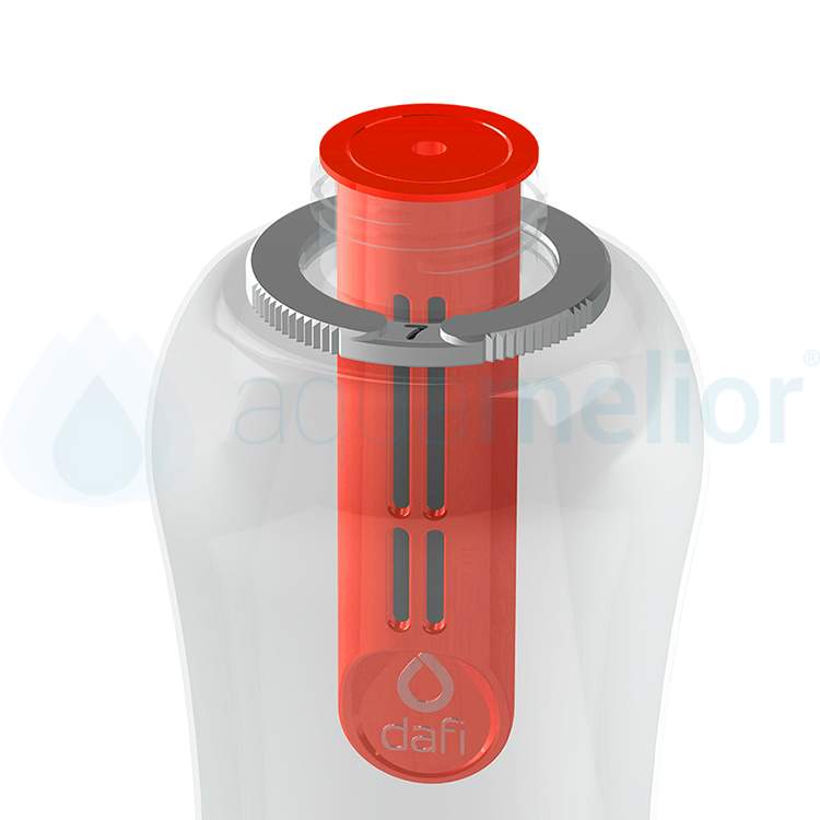 Butelka Dafi wyposażona jest w unikatowy wymienny co miesiąc filtr węglowy (100% naturalne medium filtrujące wytwarzane z łupin orzecha kokosowego). Usuwa on z wody kranowej nieprzyjemny smak i zapach chloru. Pozostawia niezmienioną ilość minerałów naturalnie w niej występujących (głównie wapnia i magnezu), dzięki czemu woda zachowuje cenne dla zdrowia pierwiastki. Lekko podwyższa pH wody, co przekłada się na jej jakość. Wykonana jest z przezroczystego, wytrzymałego tworzywa. Jest całkowicie pozbawiona szkodliwego Bisfenolu A i dopuszczona do kontaktu z wodą na podstawie odpowiednich atestów.