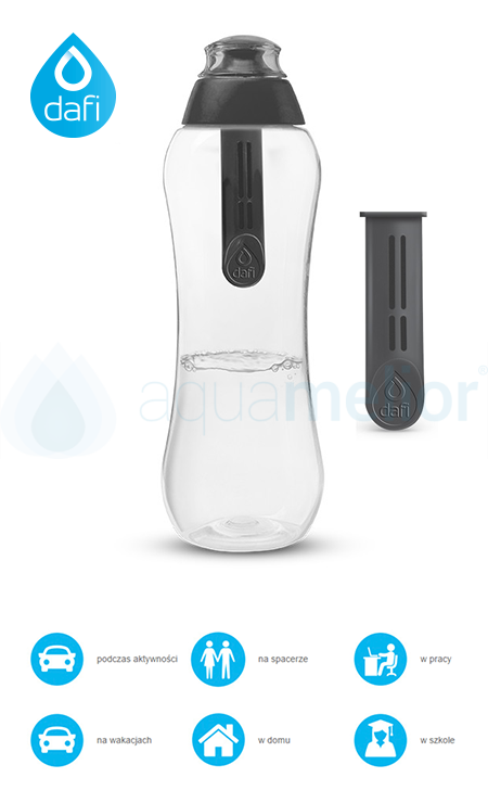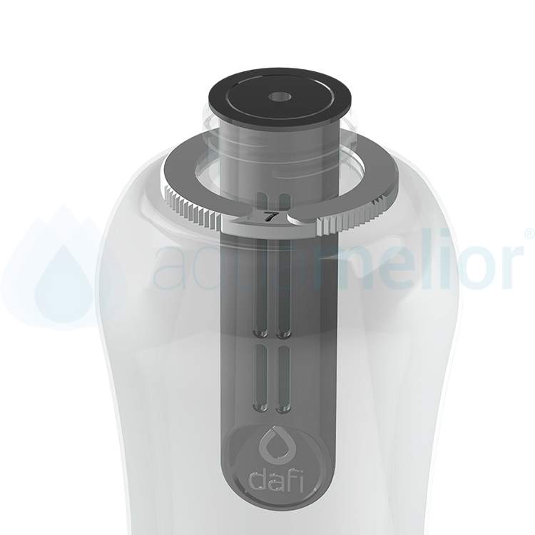 Butelka Dafi wyposażona jest w unikatowy wymienny co miesiąc filtr węglowy (100% naturalne medium filtrujące wytwarzane z łupin orzecha kokosowego). Usuwa on z wody kranowej nieprzyjemny smak i zapach chloru. Pozostawia niezmienioną ilość minerałów naturalnie w niej występujących (głównie wapnia i magnezu), dzięki czemu woda zachowuje cenne dla zdrowia pierwiastki. Lekko podwyższa pH wody, co przekłada się na jej jakość. Wykonana jest z przezroczystego, wytrzymałego tworzywa. Jest całkowicie pozbawiona szkodliwego Bisfenolu A i dopuszczona do kontaktu z wodą na podstawie odpowiednich atestów.