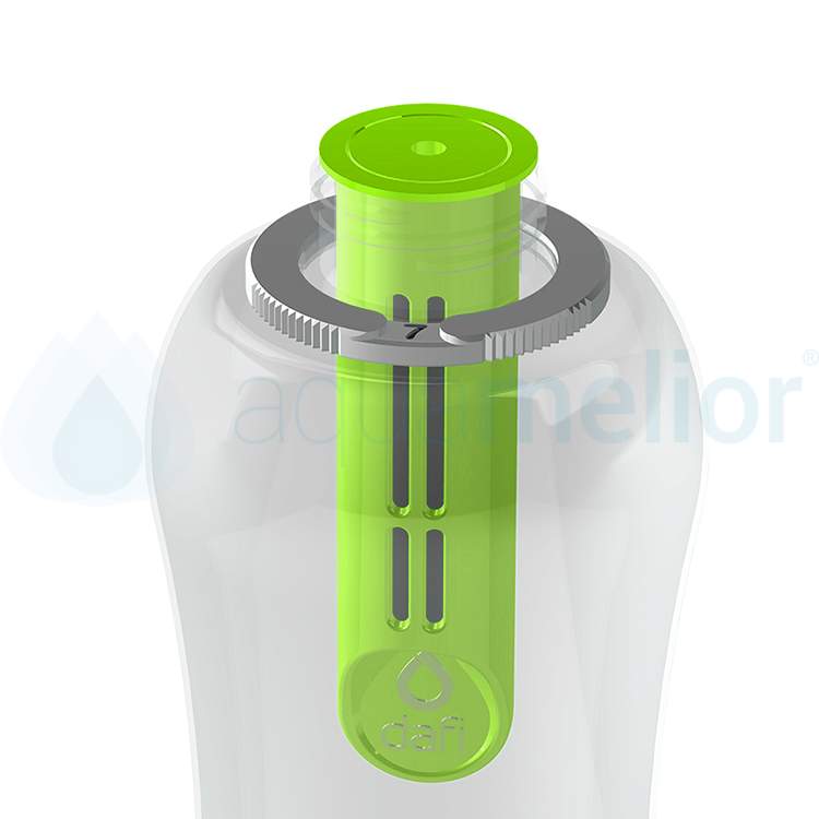 Butelka Dafi wyposażona jest w unikatowy wymienny co miesiąc filtr węglowy (100% naturalne medium filtrujące wytwarzane z łupin orzecha kokosowego). Usuwa on z wody kranowej nieprzyjemny smak i zapach chloru. Pozostawia niezmienioną ilość minerałów naturalnie w niej występujących (głównie wapnia i magnezu), dzięki czemu woda zachowuje cenne dla zdrowia pierwiastki. Lekko podwyższa pH wody, co przekłada się na jej jakość. Wykonana jest z przezroczystego, wytrzymałego tworzywa. Jest całkowicie pozbawiona szkodliwego Bisfenolu A i dopuszczona do kontaktu z wodą na podstawie odpowiednich atestów.