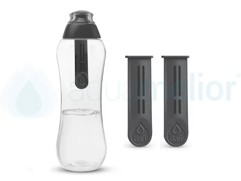 Butelka Dafi wyposażona jest w unikatowy wymienny co miesiąc filtr węglowy (100% naturalne medium filtrujące wytwarzane z łupin orzecha kokosowego). Usuwa on z wody kranowej nieprzyjemny smak i zapach chloru. Pozostawia niezmienioną ilość minerałów naturalnie w niej występujących (głównie wapnia i magnezu), dzięki czemu woda zachowuje cenne dla zdrowia pierwiastki. Lekko podwyższa pH wody, co przekłada się na jej jakość. Wykonana jest z przezroczystego, wytrzymałego tworzywa. Jest całkowicie pozbawiona szkodliwego Bisfenolu A i dopuszczona do kontaktu z wodą na podstawie odpowiednich atestów.