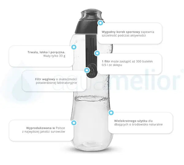 Pierwsza butelka filtrująca wodę wyprodukowana w Polsce. Zaprojektowana dla osób, które doceniają rolę regularnego nawadniania organizmu, uprawiają sport i praktykują zdrowy styl życia. Dzięki korzystnym gabarytom i ergonomicznej budowie, możesz mieć ją zawsze przy sobie nie martwiąc się o konieczność kupowania wody w jednorazowych opakowaniach.