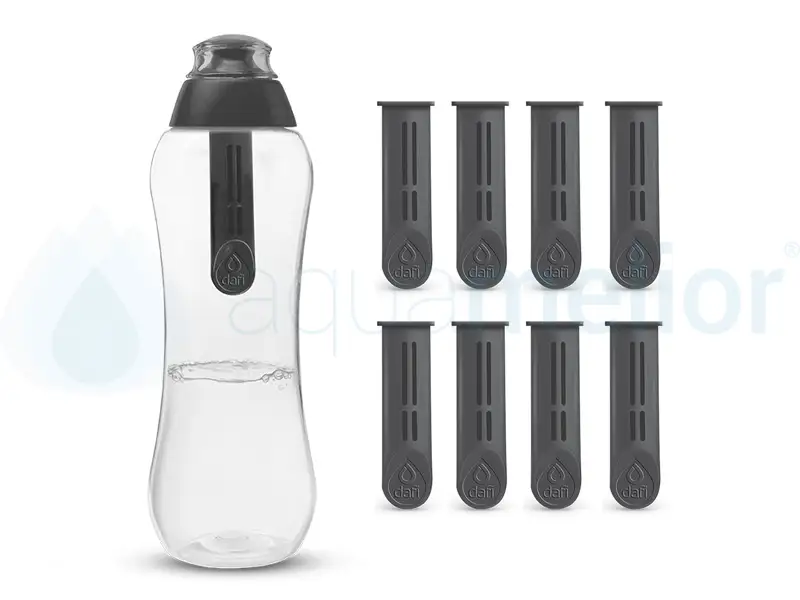 Butelka Dafi wyposażona jest w unikatowy wymienny co miesiąc filtr węglowy (100% naturalne medium filtrujące wytwarzane z łupin orzecha kokosowego). Usuwa on z wody kranowej nieprzyjemny smak i zapach chloru. Pozostawia niezmienioną ilość minerałów naturalnie w niej występujących (głównie wapnia i magnezu), dzięki czemu woda zachowuje cenne dla zdrowia pierwiastki. Lekko podwyższa pH wody, co przekłada się na jej jakość. Wykonana jest z przezroczystego, wytrzymałego tworzywa. Jest całkowicie pozbawiona szkodliwego Bisfenolu A i dopuszczona do kontaktu z wodą na podstawie odpowiednich atestów.