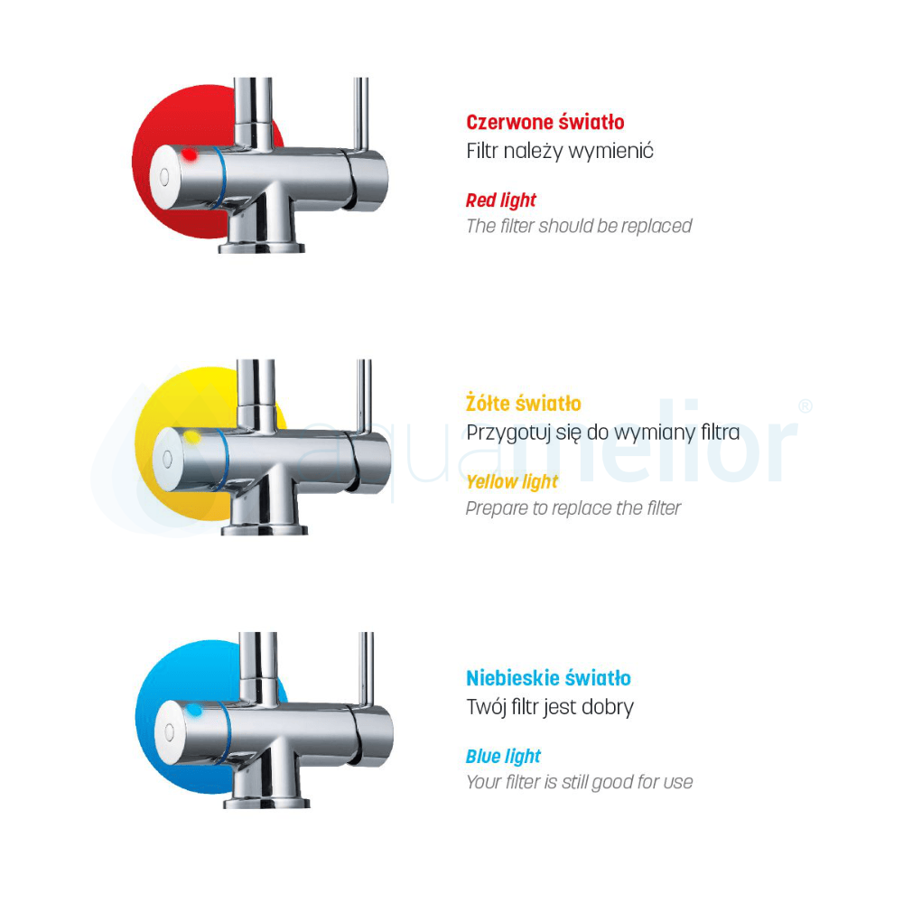 Filt znajdujący się w Flow Comfort D3 posiada żywotność do 12 miesięcy w zależności od poziomu twardości wody. Możemy to zmierzyć za pomocą paska do zmierzenia poziomu twardości, który znajduje się w zestawie Dafi. O konieczności wymiany filtra będzie nas informować wskaźnik LED. Należy wcześniej wprowadzić ustawienie zgodne z poziomem twardości wody.
