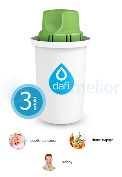 Filtr alkaliczny został stworzony z myślą o osobach, które chcą polepszyć jakość wody kranowej i zaspokajać pragnienie zmineralizowaną wodą o właściwościach zasadotwórczych. Woda przefiltrowana Dafi pH+ jest najlepszą alternatywą wody butelkowanej. Zawarte w niej minerały takie jak jony wapnia, sodu i magnezu sprawiają, że woda jest smaczna i zdrowa.
