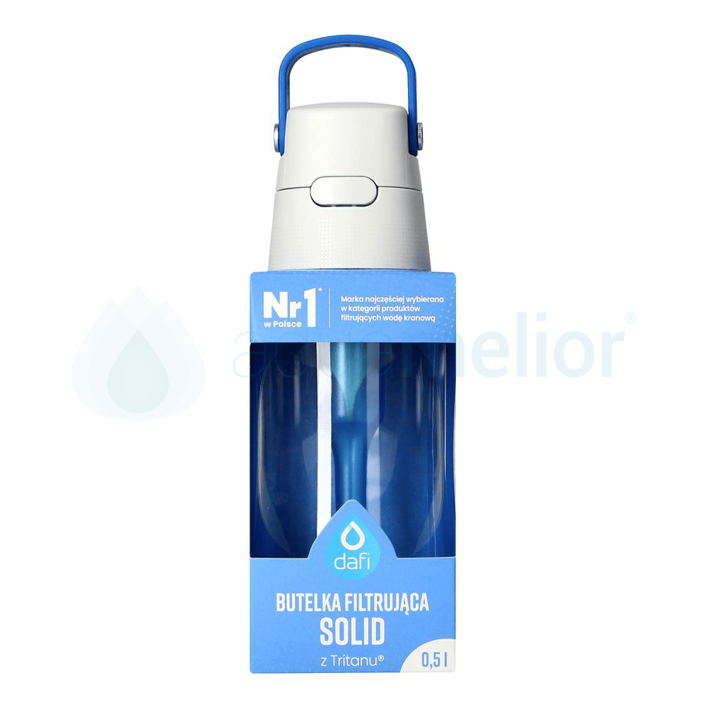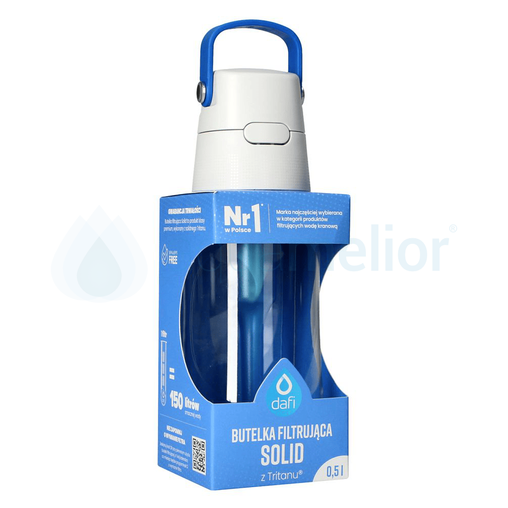 Butelka filtrująca Dafi Solid ma pojemność 0,5 l i korzysta z klasycznych filtrów do wody Dafi. Filtr węglowy stosowany w butelkach Dafi jest w 100% pochodzenia naturalnego. Do jego produkcji używa się łupin kokosa. Usuwa z wody nieprzyjemny smak w zapach np. chloru. Oczyszcza wodę kranową z zanieczyszczeń, drobin piasku, jakie znajdują się rurociągu. Taka woda jest krystalicznie czysta, smaczna i zdrowa. Jeden filtr jest w stanie przefiltrować 150 litrów wody. Producent zaleca jego wymianę co 30 dni.