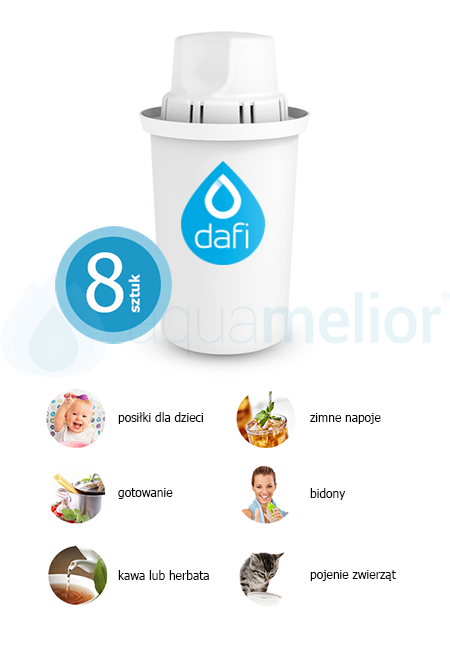 Dzbanki filtrujące wodę są aktualnie bardzo modne, gdyż świat stale dąży w kierunku poprawy ekologii i zdrowego żywienia. W końcu dorosły ludzki organizm, aż w 60% składa się z wody, która tym samym jest prawdziwym budulcem życia. Cały świat bez wody przestałby istnieć. Warto zatem zadbać o dostarczanie sobie codziennie dużej ilości czystej wody. Na tej podstronie firma Aquamelior oferuje filtry Dafi Classic w ilości 8 sztuk, które pozwalają na przefiltrowanie aż 150 litrów wody lub na pełne 30 dni działania.