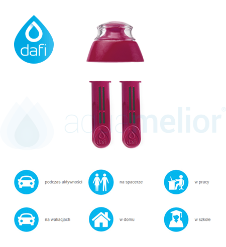 Butelka filtrująca DAFI wymaga do poprawnego działania cyklicznej wymiany filtra, gdyż ten zużywa się podczas oczyszczania kolejnych litrów wody kranowej. Dostępny w sklepie Aquamelior.pl filtr do butelki DAFI jest w czerwonym kolorze i będzie doskonale spełniał swoją funkcję, jak i przyciągnie uwagę ludzi wokoło. Filtr wzorowo niweluje w wodzie kranowej posmak chloru, usuwa wiele nieprzyjemnych zapachów i pozwala na spożywanie jej tuż po przefiltrowaniu. Jego dużą wydajność gwarantuje zastąpienie nawet 300, półlitrowych butelek wody mineralnej, co generuje ogromne koszty przy zestawieniu ich z ofertą butelek filtrujących DAFI. Co ważne, nowoczesne, inteligentne filtry usuwają jedynie wszelkie obecne w wodzie drobnoustroje i zanieczyszczenia, pozostawiając składniki niezbędne do prawidłowego funkcjonowania ludzkiego organizmu.