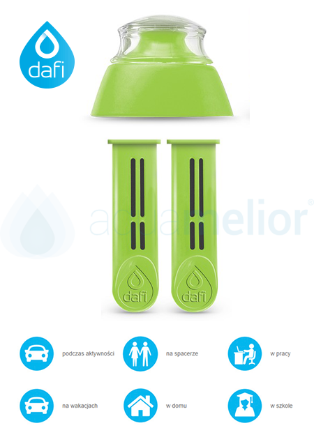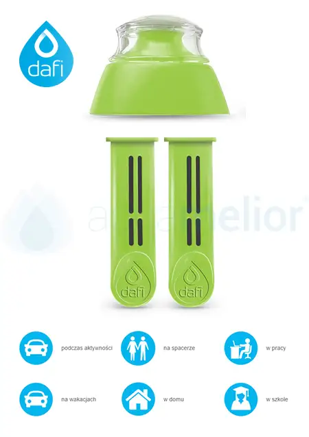Jeden filtr wystarczy na oczyszczenie 150 litrów wody, czyli 300 butelek o pojemności 0,5 litra. Zapewni Ci smaczną wodę wszędzie, gdzie jest dostęp do wody z kranu. Wystarczy nalać wody, nałożyć zieloną nakrętkę z umieszczonym filtrem i gotowe. Filtr Dafi posiada obrotowy datownik, który przypomni o comiesięcznej wymianie filtra. Sklep internetowy Aquamelior.pl ma w swojej ofercie zieloną nakrętkę z dwoma wymiennymi filtrami.