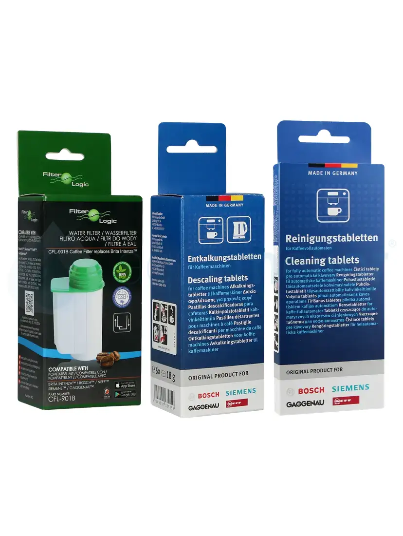 Zestaw do konserwacji ekspresu Bosch Siemens (Filtr FilterLogic CFL-901B + Tabletki czyszczące Bosch TCZ6001 i Tabletki odkamieniające Bosch Siemens TCZ6002)