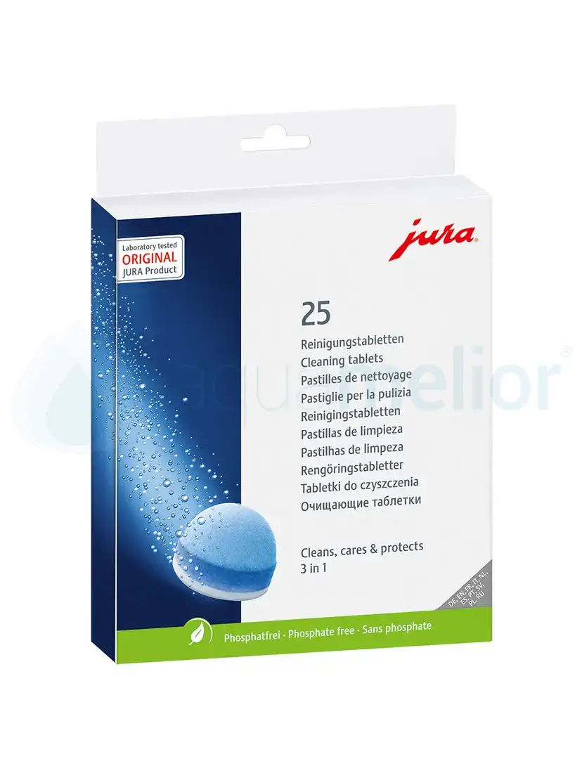 Nowość od marki Jura - trójfazowe tabletki czyszczące do ekspresów Jura 24190. Eksperci Jura stworzyli następcę niezwykle popularnych i cenionych tabletek czyszczących Jura 62535. Nowe, trójfazowe tabletki jeszcze lepiej oczyszczają ekspresu automatyczne Jura z resztek kawy, tłuszczy i olejów, jakie pozostają wewnątrz mechanizmu. Każde opakowanie Jura 24190 posiada 25 tabletek, które wystarczą na bardzo długo. Producent ekspresu zazwyczaj deklaruje jak często czyścić urządzenie. Ze swojej strony zalecamy robić przynajmniej raz na miesiąc.